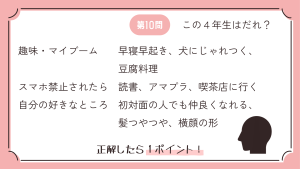 今回のアイブレは『4年生王(仮)』でした。13人いる4年生から7人ピックアップして趣味などを当てるクイズを行いました。