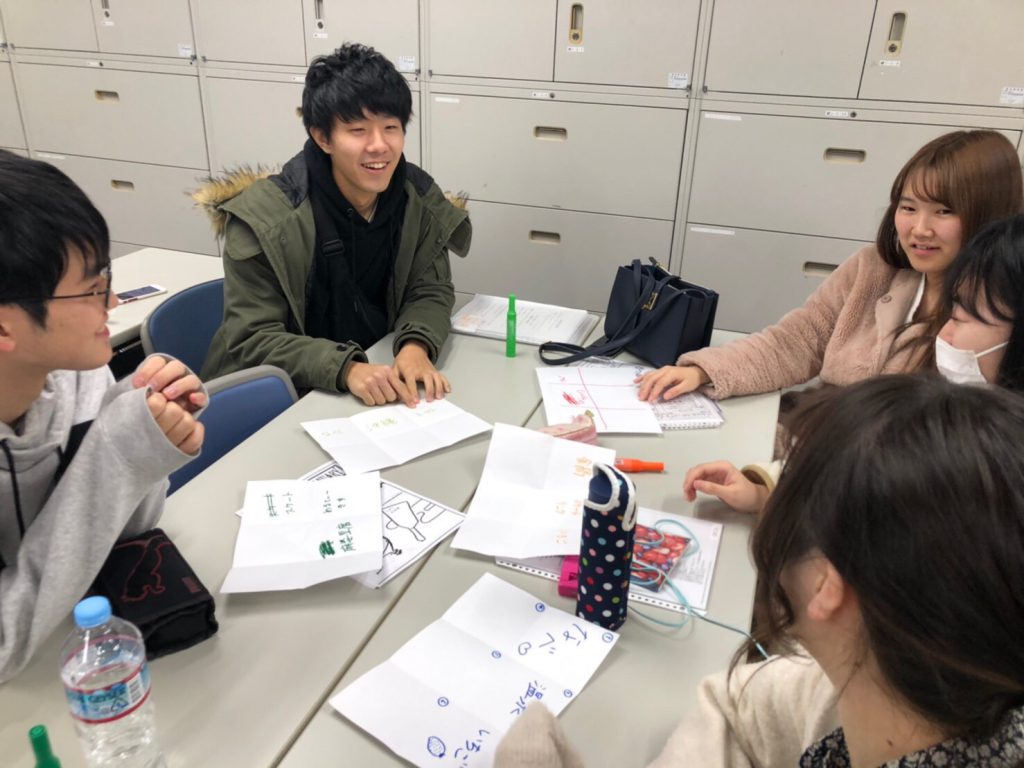 ①今回のアイスブレイクはキーワード連想ゲームをやりました。お題から連想される答えを書いて、班の中で回答が同じだった人数に応じてポイントが貰えるというゲームです。冬に食べたいものは?というお題に対して全ての班が鍋でポイントをとっていたのは驚きでした!県南の約半分の人が鍋を連想するという、仲の良さも伺えました!