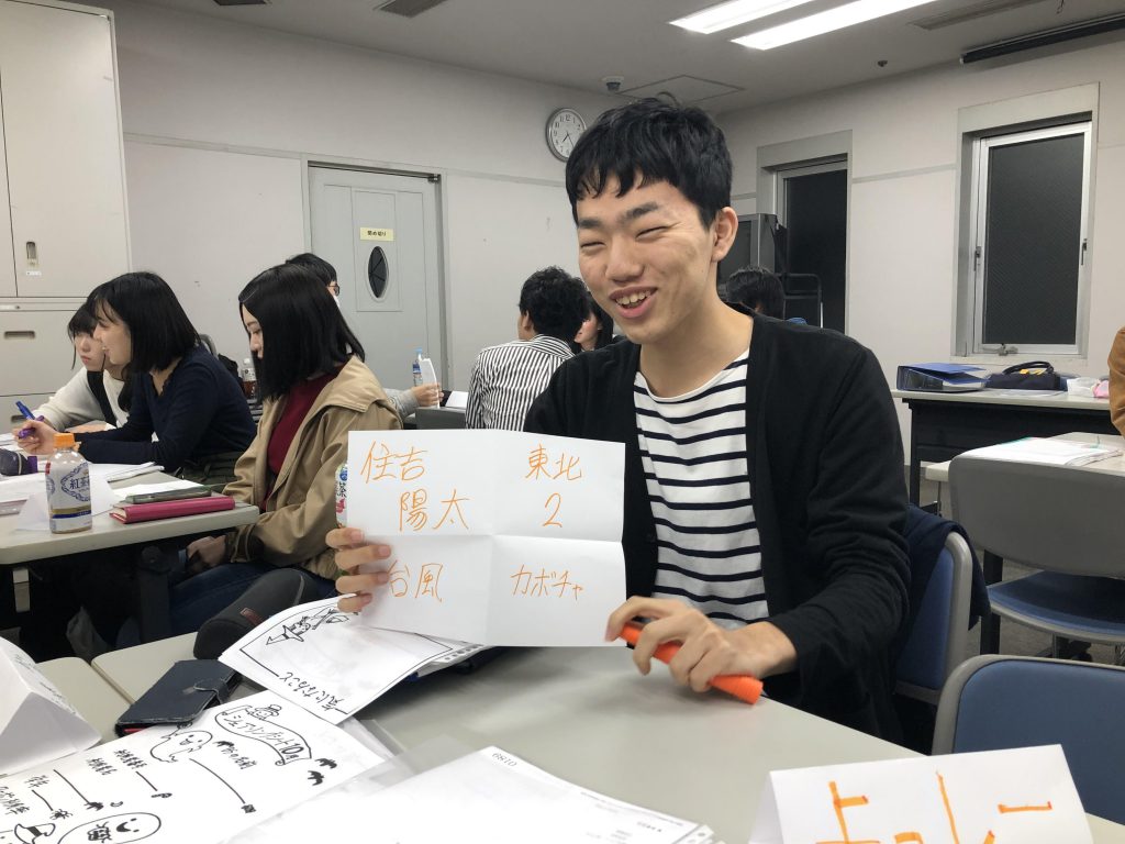 ①アイブレ紙を4つ折りにして、「名前」「学校・学年」「最近あった出来事」「何の仮装をしたいか」をそれぞれ書いて発表しました。ユニットの中でも知らない人がいたので、改めてお互いを知ることの出来る良い機会になったと思います?