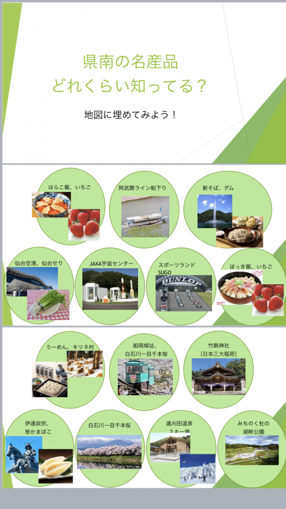今月のアイスブレイクは「県南クイズ!!」と題して、仙台より南の地区の白地図に市町村名を書き加えていくクイズを行いました。県外出身のBSも多く、これだけではなかなか難しいので、名産品や観光名所をヒントにしてそれぞれ悪戦苦闘しました。