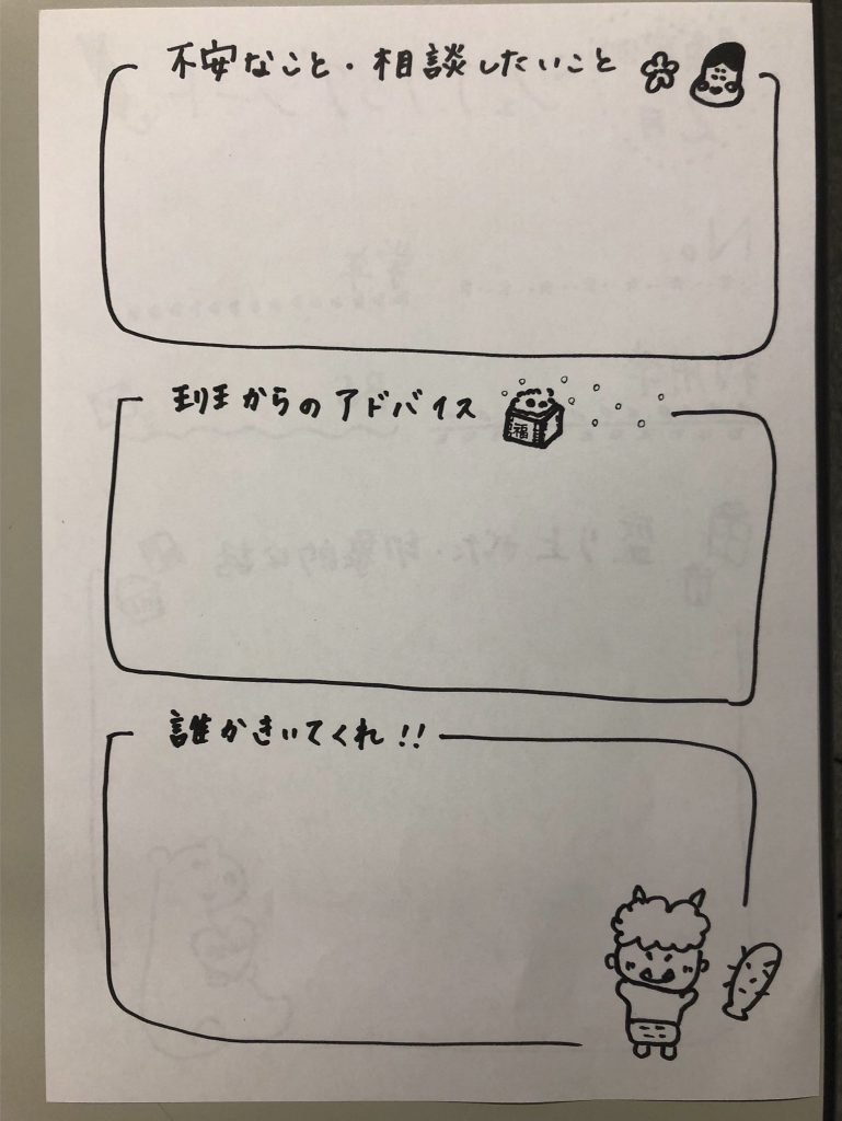 5分ほど班で話し合いして、それぞれの案をフォームにまとめました。私たちの班では、「無理にその話にする必要はないが、話して楽になれるなら丁寧に話を聞けばいいのでは」などの意見が出ました。フォームに利用者やBSの助けになるような案がきっとあると思います。