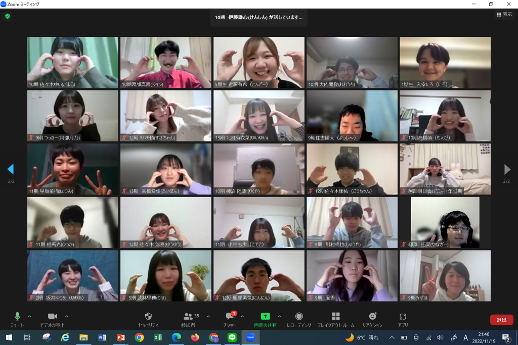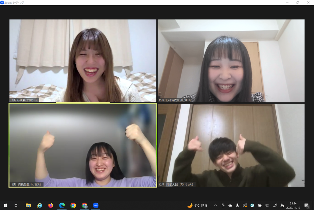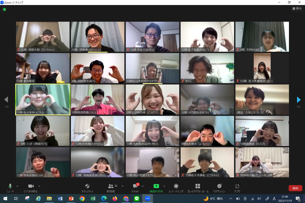 今回はオンラインで開催し、OBOG17名・現役生21名に参加していただきました!