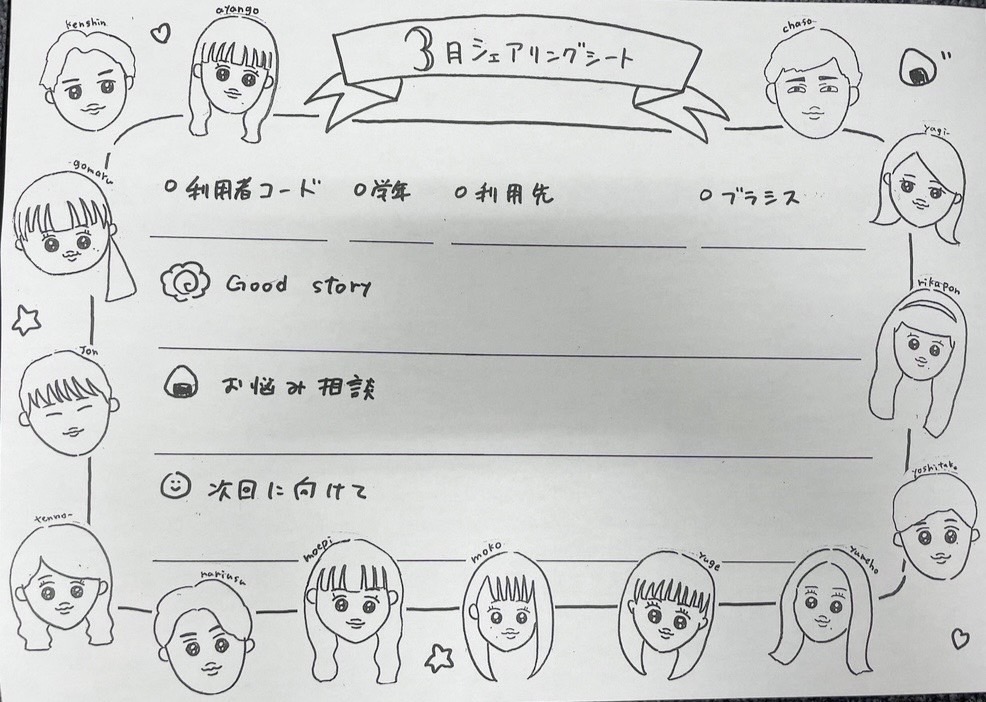 各班に分かれて行いました‼ 今回は県北ULののりちゃんがシェアリングシートを書いてくれていました‼‼本当にすごいシェアリングシートで卒業生一人一人、みんなの似顔絵が書いてありました‼‼すごすぎる‼‼‼‼本当にありがとう‼