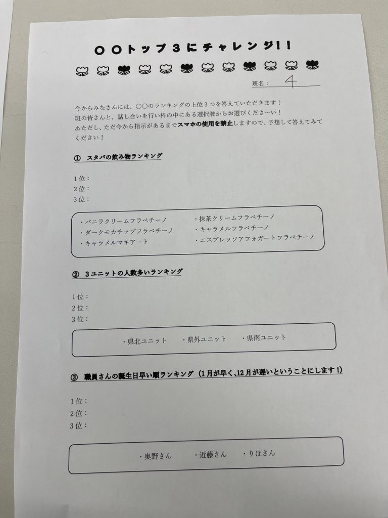 アイスブレイクは〇〇トップ3にチャレンジでした!楽しくて盛り上がりました!!答えが気になる人は県外BSに聞いてみてね👂