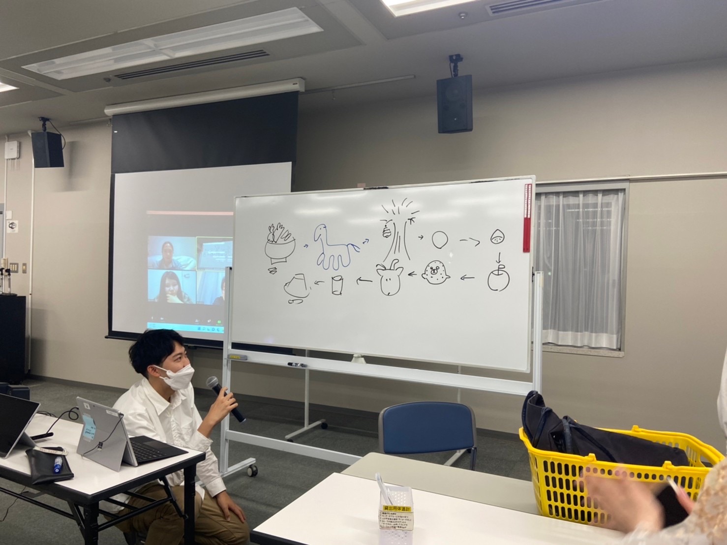 今月のアイスブレイクでは、絵しりとりをオンラインの人(あいうえお順)→対面の人(背の順)で全員で繋げていきました。きぶんで、制限時間は1人15秒、、「い」からスタート、みんなの絵心が試されましたが、なんとか、最後まで繋がったようですよ~(一部こじつけあり⁉︎だやゴメン)👏。