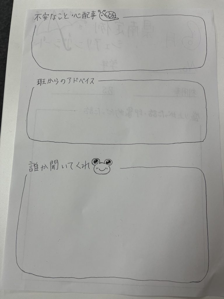 別室登校になった。自分のペースで好きな自習をしている。別の学年の人もいる。後輩ちゃんとか先輩に話しかけた。同じクラスの不登校の友達がいて、話しかけた、可愛かった。話したい先輩がいるけど、まだ話しかけられてない。一人じゃないから大変なこともあるけど、学校行くハードルは下がった。落ち着いている。今の目標は欠席にしないこと。部活は行っていない。