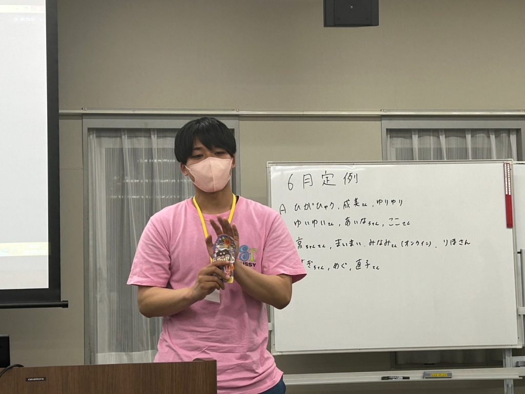 ・新歓が終わりました。みなさんご協力ありがとうございました。養成研修もフォローアップも現役生の協力が必要です。みなさんよろしくお願いします。キックオフは全員参加。どうしてもの用事以外は参加してね。予定はLINEにあります。日程の確保よろしくお願いします。