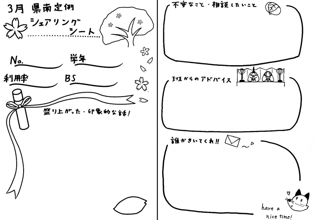 今月のシェアリングシートは私が書かせていただきました。このシェアリングシートが最後に記入するものになるという方々のためにも、油性ペンとPCのペイントツールをダブルで駆使して頑張りました!