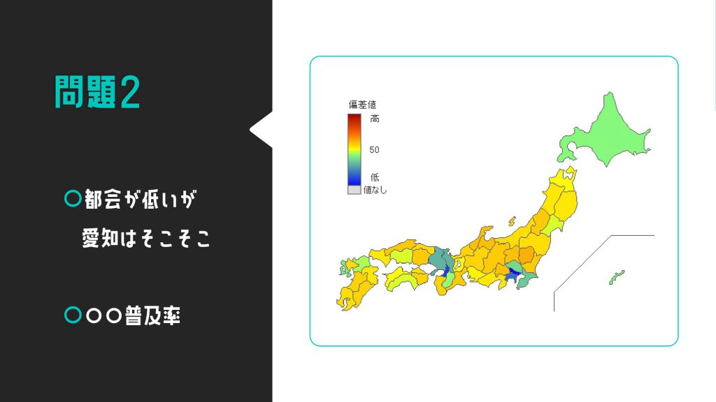 こんな問題です。なんだか中高で習った日本地理を思い出しますよね~。ちなみにこれは自動車普及率のグラフです!ふなはるのハイクオリティなスライドもあり、とても楽しいクイズでした!